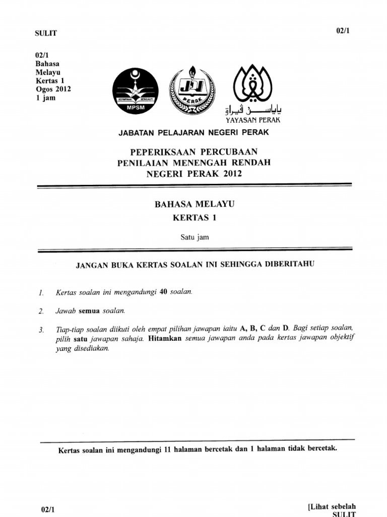 Bahasa Melayu Kertas 1 2 Percubaan Pmr 2012 Perak Pdf